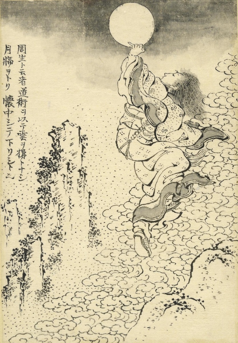 This is one of Hokusai’s works that was never woodblock printed so it was preserved as it was originally painted. This is from an encyclopedia Hokusai was writing that had all sorts of drawing depicting many things. This art particularly depicts one of Chinese famous folk tale which shows clear Chinese influence on Edo Japan as they had great trade relations. The story behind this art goes that Daoist master Zhou Sheng told his friend that he is able to climb to the skies and pluck the moon and then proceeded to do so. Here Hokusai depicts this scene masterfully by showing the linear ascending cloud pattern and from the position of the legs we can tell that he is climbing up. Towards the left of the drawing, we can also see a mountain whose peak drawn in Chinese style, is a bit under the human figure giving us perspective as to how high this figure actually is compared to their surrounding nature. He uses small dots to show the mists surrounding the mountains again adding the portrayal of how high the human figure is in this case.